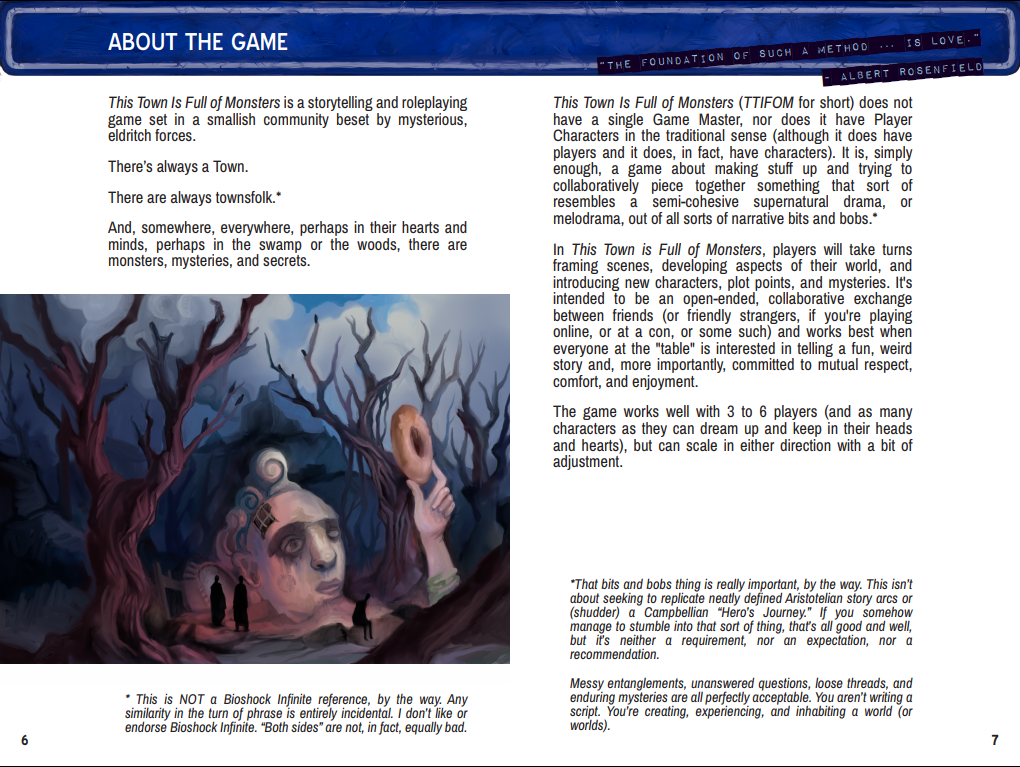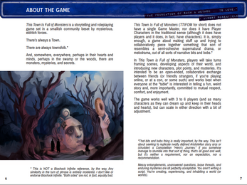 This Town Is Full of Monsters is a tabletop storytelling/roleplaying game about a smallish community beset by mysterious, eldritch forces. There’s always a Town. There are always townsfolk. And, somewhere, everywhere, perhaps in their hearts and minds, perhaps in the swamp or the woods, there are monsters, mysteries, and secrets.