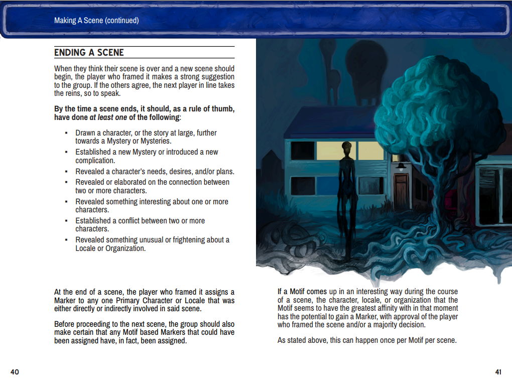 If you want to build a Twin Peaks / Stranger Things / Life is Strange / Donnie Darko type story and/or world with the help of a couple of friends or friendly strangers, this game may well be a good fit for you. That said, It has also proven to work quite well for stories set in all kinds of worlds and places, well apart from sleepy, small American coastal towns and suburbs. Some notable actual plays have featured underwater casino towns, post apocalyptic cities populated by giant seagulls, and distant nebulae populated by all kinds of divine and terrestrial beings. (So, you know, please don't feel like you HAVE to do a Twin Peaks pastiche, because you can do whatever the heck you want).*